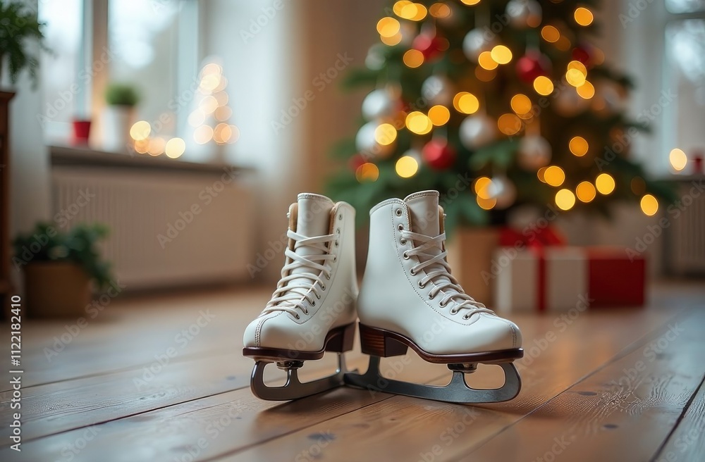White skates against a festive New Year background. Space for text, free space. #1122182410