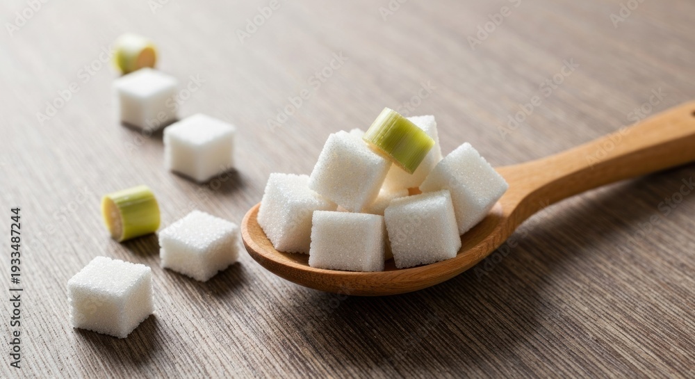 White sugar cubes on a wooden spoon, scattered around the spoon. Small pieces of light green sugarcane are beside the cubes #1933487244