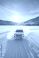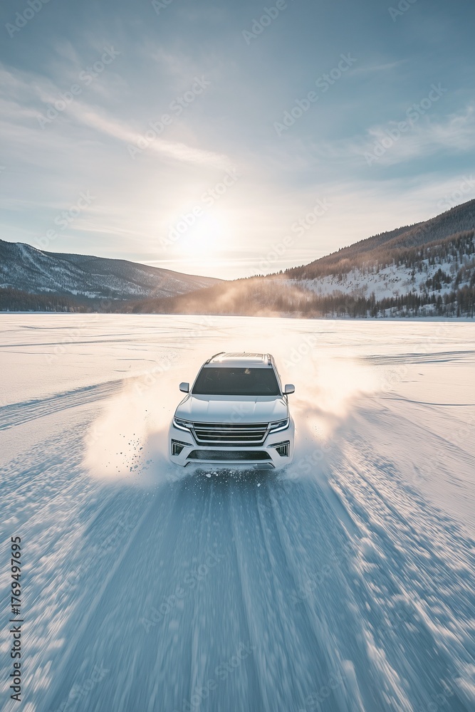 White SUV driving on icy lake with mountains in distance and sunlight shining through while snowflakes fly around creating surreal scene #1769497695