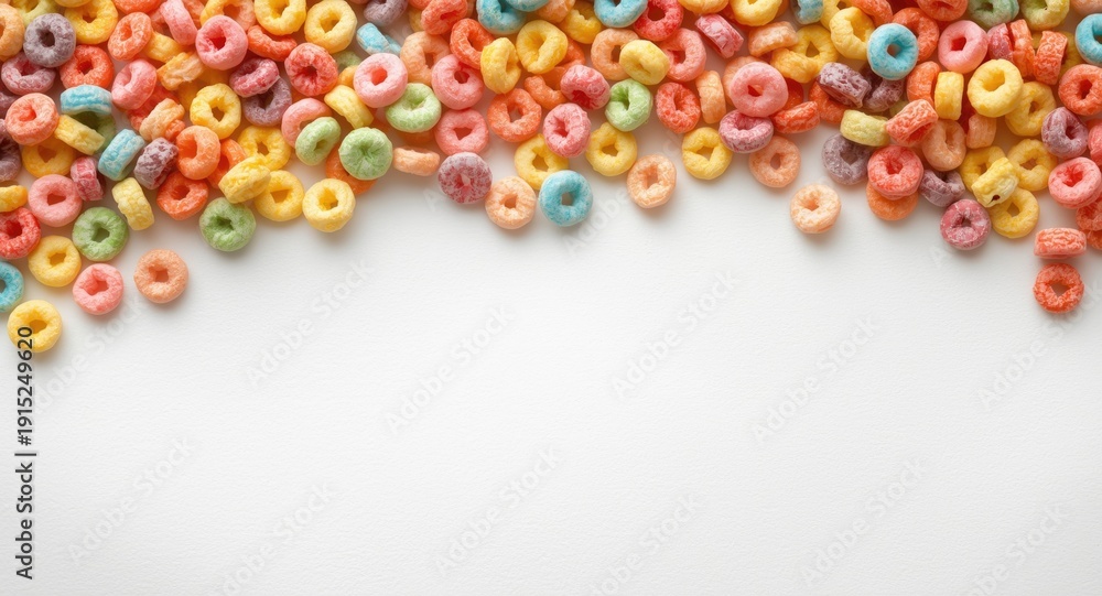 White textured background filled with multi colored fruit loops and copy space #1915249620