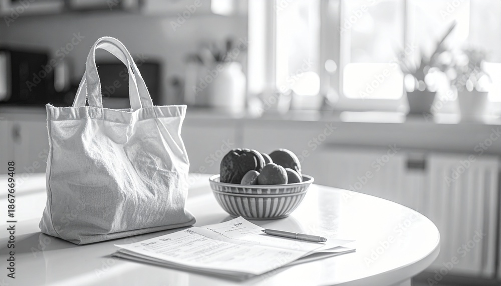 White tote bag and bowl of fruits on kitchen table #1867669408