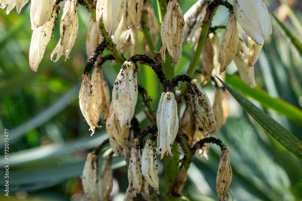 White yucca flowers covered with black aphids, close-up of plant pest and disease in garden #1772075477