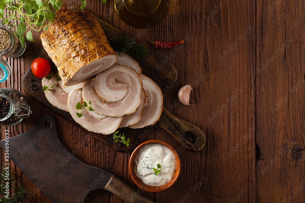 Whole bacon roulade. Served in sliced meat with white sauce. Top view. #336696893