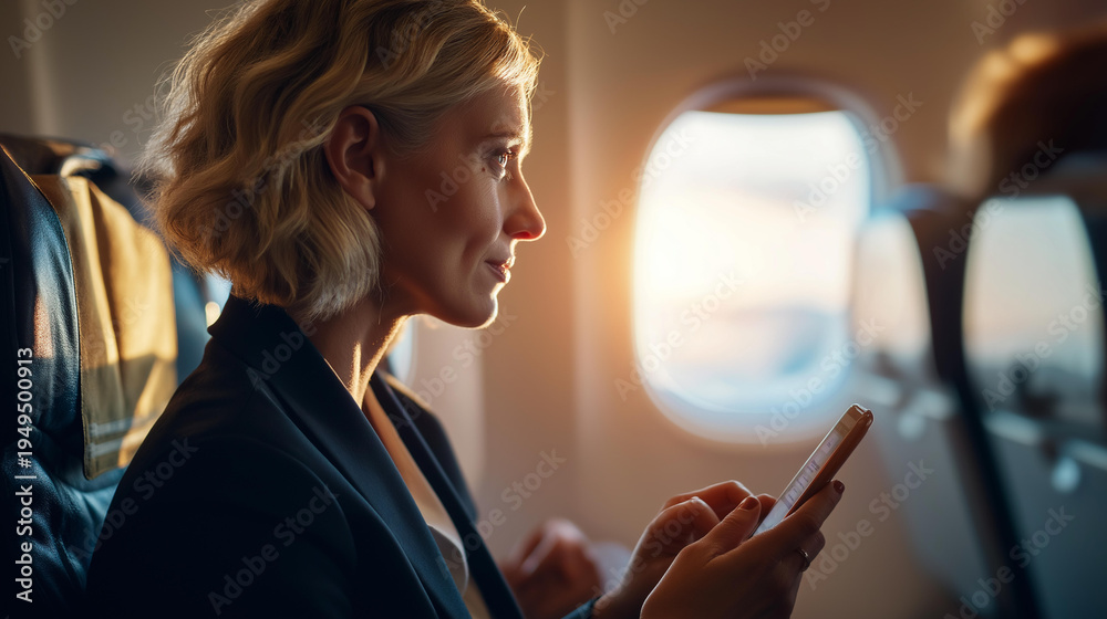 Wide bright airplane cabin scene of a faceless businesswoman from behind in a window seat holding a smartphone and looking out at the aerial view through the cabin window warm #1949500913