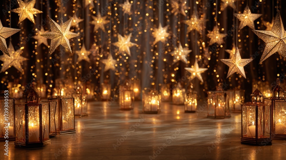 Wide christmas decoration banner background featuring elegant gold glowing star lanterns illuminating the floor, creating a warm festive ambiance with soft light reflections and holiday charm for seas #1739380553
