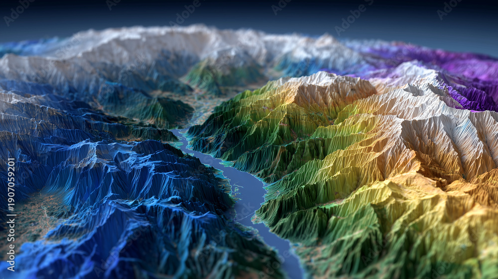 Wide cinematic perspective of a 3D topographical map, vibrant elevation gradients, GIS spatial data overlays for population and infrastructure, mountains and river basins shown in #1907059201