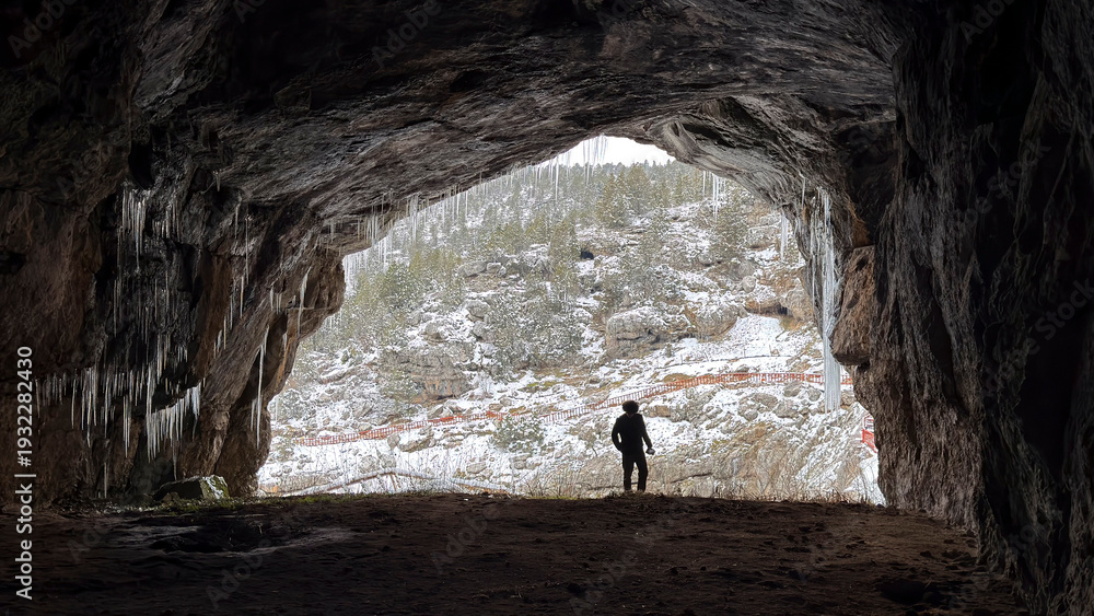 Wide-mouthed cave structure, curious explorer, and ice stalactites hanging from the ceiling in winter. #1932282430