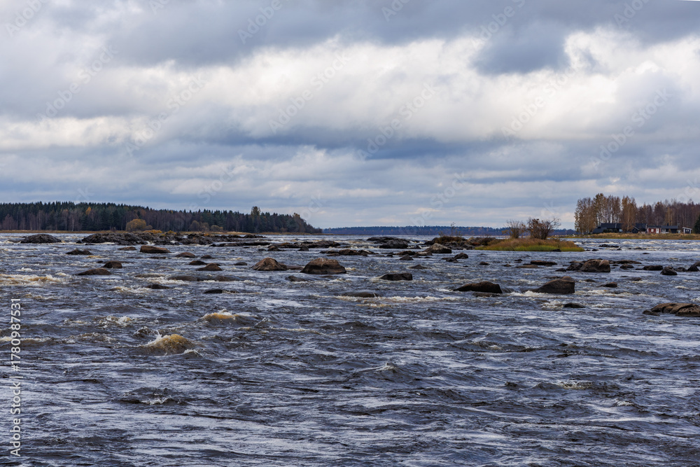 Wide river landscape in Finland under dramatic cloudy sky with dark water and rocky stream, symbolizing Nordic nature, wilderness, and the power of natural water flow #1780987531