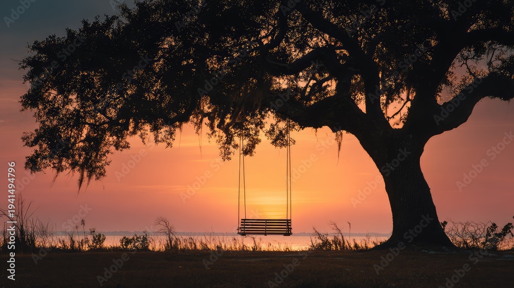 Wide sunset view with swing beneath giant tree silhouette against glowing evening sky #1941494796