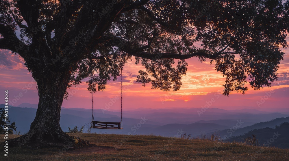 Wide sunset view with swing beneath giant tree silhouette against glowing evening sky #1941494834