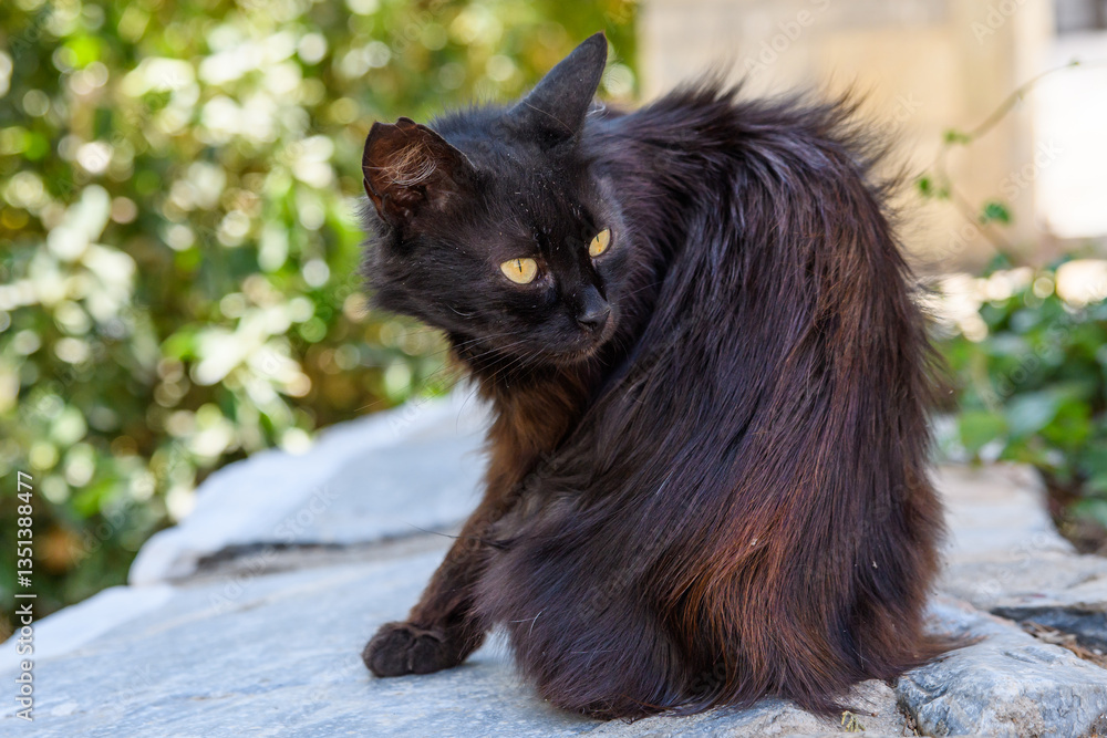 Wild cat, Feral black cat, cleaning its fur whilst keeping a cautious look out. #1351388477