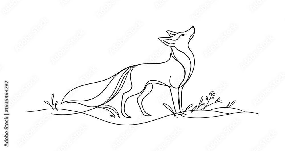 "Wild Fox Silhouette". Minimalistic one-line drawing elegant fox with flowing tail standing within gentle #1935494797