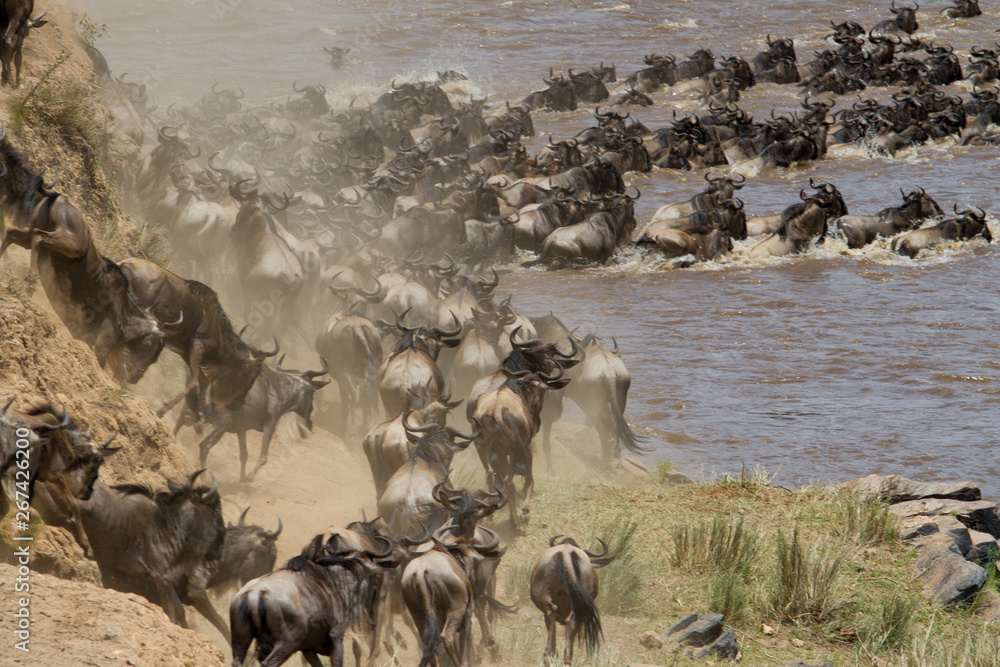 wildebeest crossing yhe Mara River in the migration season in the Masai Mara Game Reserve in Kenya #267426200