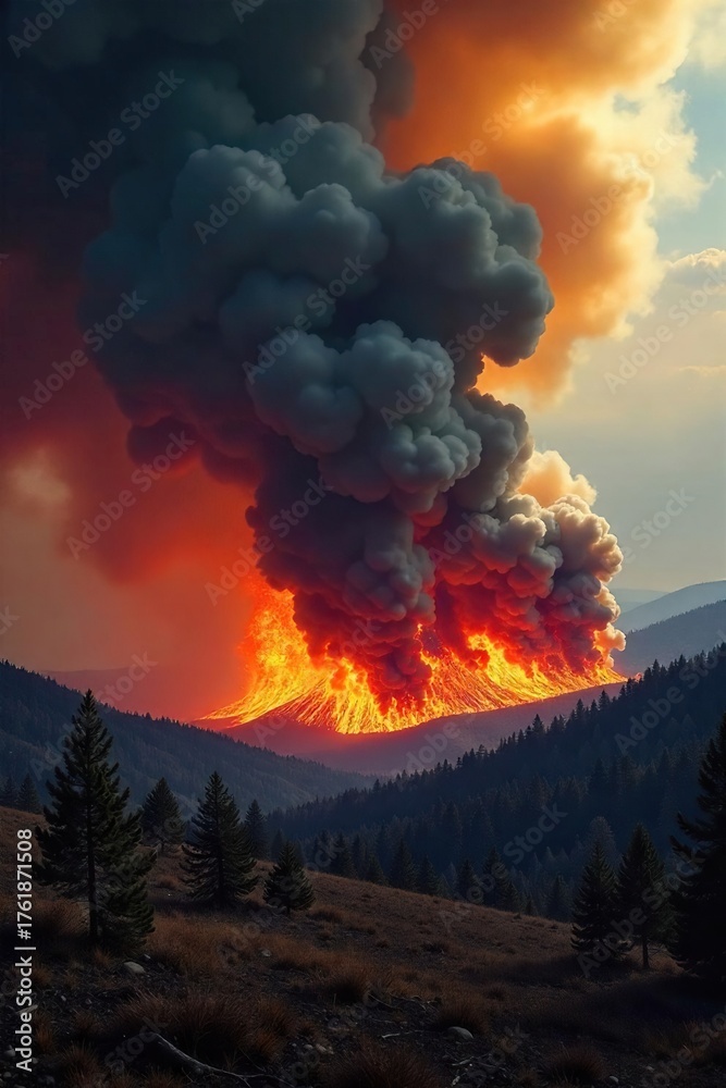 Wildfire Inferno Devastating Forest Fire Rages, Sending Smoke Plumes into the Sky, Illuminating a Charred Landscape, Highlighting Natures Fury and the Urgent Fire Hazard. #1761871508