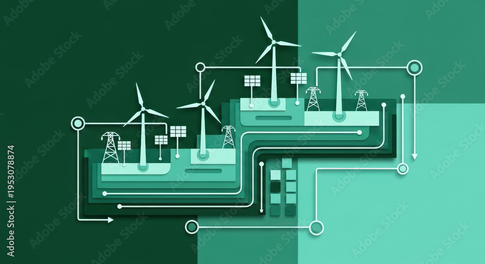 Wind energy concept, geometric structured composition with modular wind turbine shapes arranged in a clean grid landscape, #1953078874