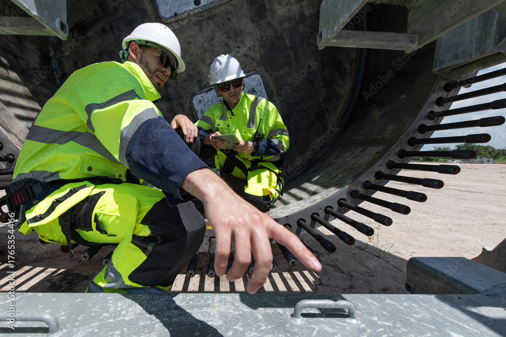 Wind Turbine Maintenance and Repair Technician, Engineer Checking Turbines working maintenance clean power generator system #1765354466