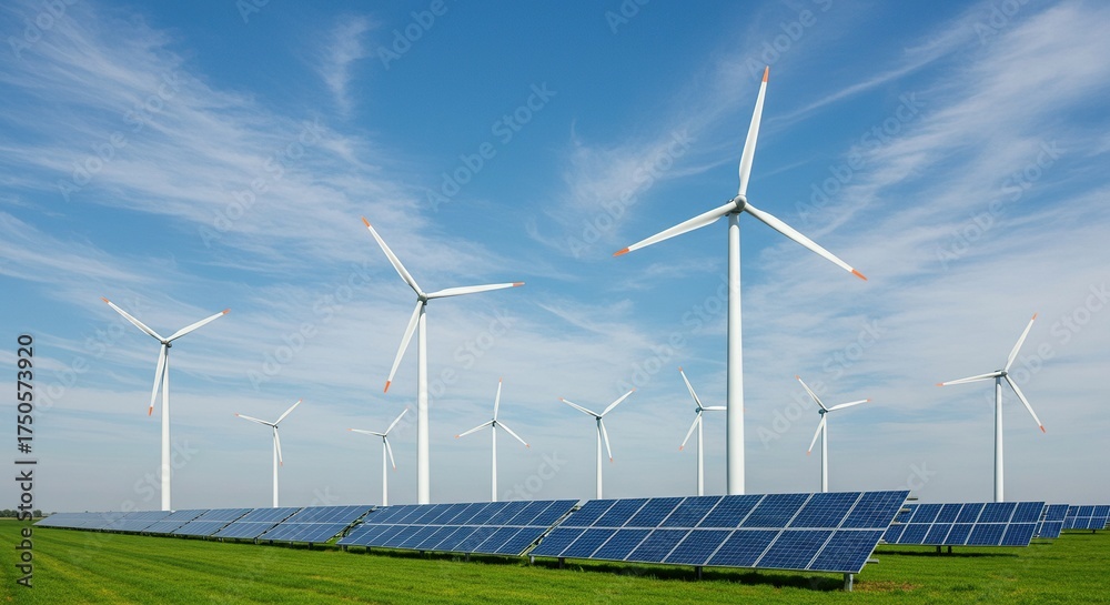 Wind turbines and solar panels rise majestically against a vibrant green landscape, symbolizing a clean, renewable energy future for the planet ,sustainable ,solar panels ,energy source #1750573920
