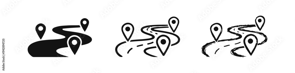 Winding road with map pins icon set. Navigation, journey, route, travel, and location concept. #1942894720
