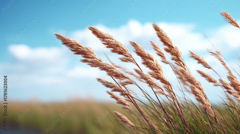 Windswept meadow swaying in warm breeze, Sunshine and blue sky #1781623004