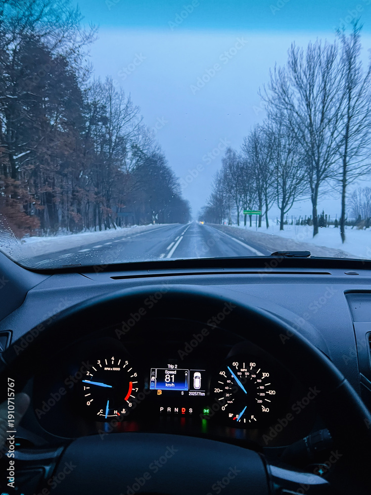 Winter drive from the cockpit: snowy highway ahead seen through the windshield #1910715767