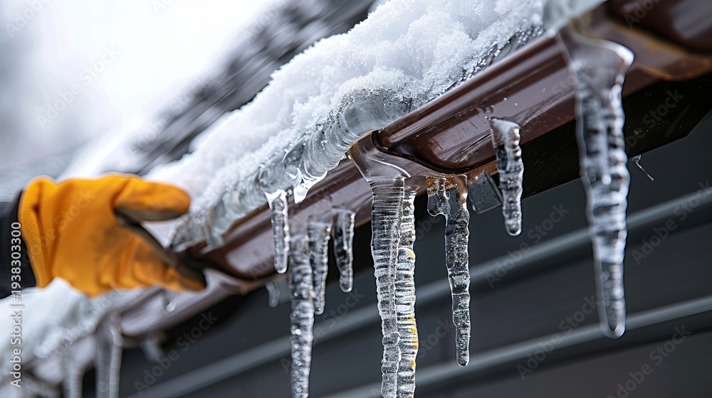 Winter home maintenance clearing ice from roof gutters for effective drainage repair #1938303300