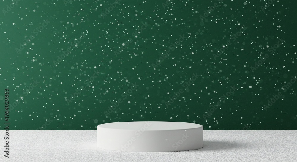 Winter scene with snowy platform against green backdrop with falling snow. Ideal for product showcase. #1764029853