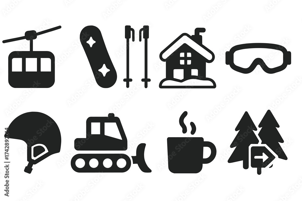 Winter sports silhouette icon set. skiing, snowboarding, winter gear solid collection #1742892614