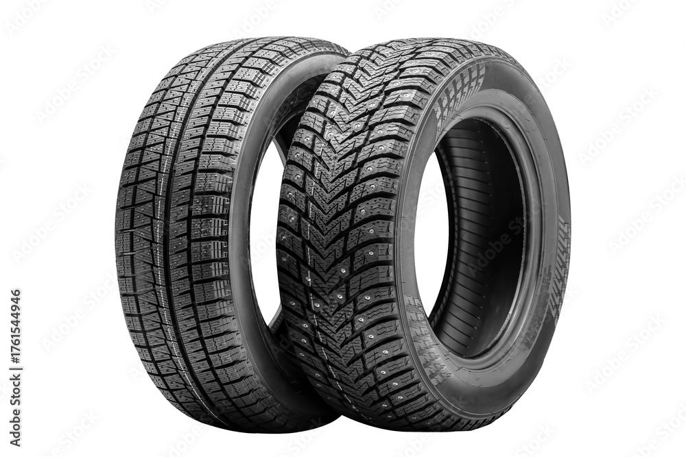 Winter tires offer enhanced traction and control for driving in snowy and icy conditions. This visual showcases two tires with distinct tread patterns designed for winter performance. #1761544946
