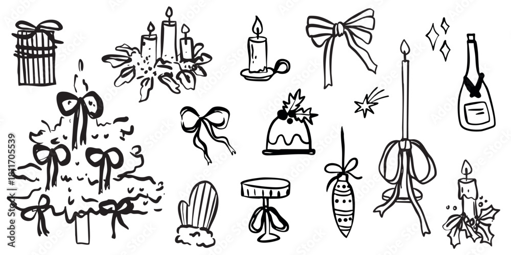 Winter whimsical christmas tree doodle sketch vector illustration. Holiday line art simple party decoration for new year. Minimalist snowflake outline set. #1811705539