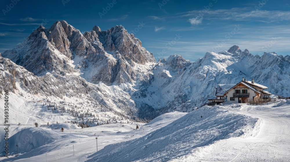 Winter wonderland in the dolomites alps featuring a scenic ski resort surrounded by snow-covered peaks, alpine trees, and clear blue sky, capturing the serene beauty of the italian mountain landscape #1693504096