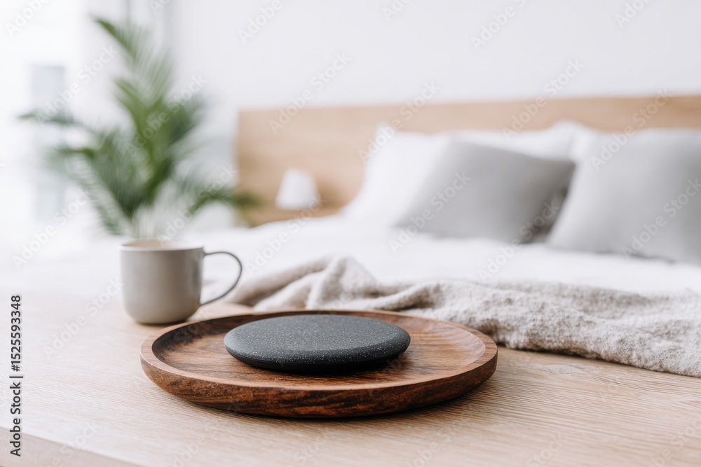 wireless charger on wooden nightstand bathed in soft morning light #1525593348