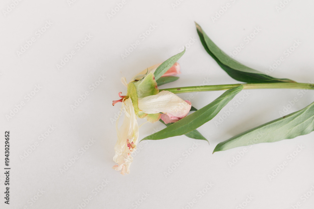 Withered peony flower delicate petals losing shape on clean white background symbolizing fragility and decay #1943029652