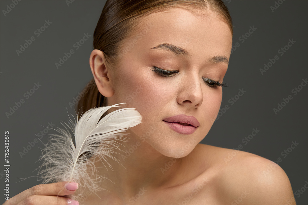 Woman applying smooth lotion to her face while holding a soft feather in a minimalist setting, emphasizing natural beauty and skin care techniques #1752430513