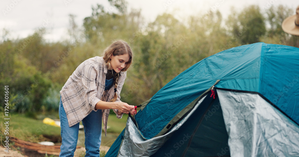 Woman, camping and pitch tent in nature, gear and rope for safety on holiday adventure in summer. Girl, knot and equipment with fabric for shelter construction on vacation, tourism or getaway in bush #1726401601