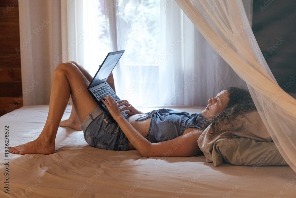Woman digital nomad lying on bed with laptop under mosquito net in wooden bungalow, remote work, online communication and email concept #1926278572