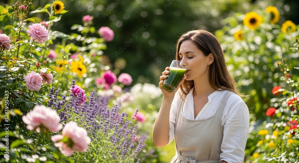Woman enjoys green juice in a vibrant garden, symbolizing wellness and nature's healing. #1761950433