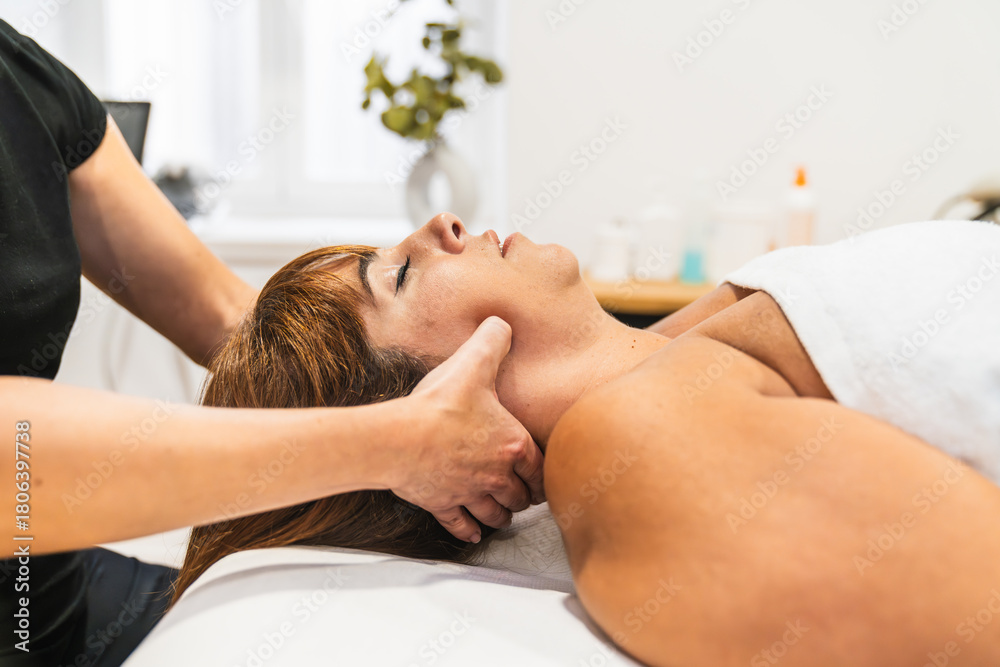 Woman experiencing relief from jaw pain, receiving a tmj treatment and massage from a physiotherapist #1806397738