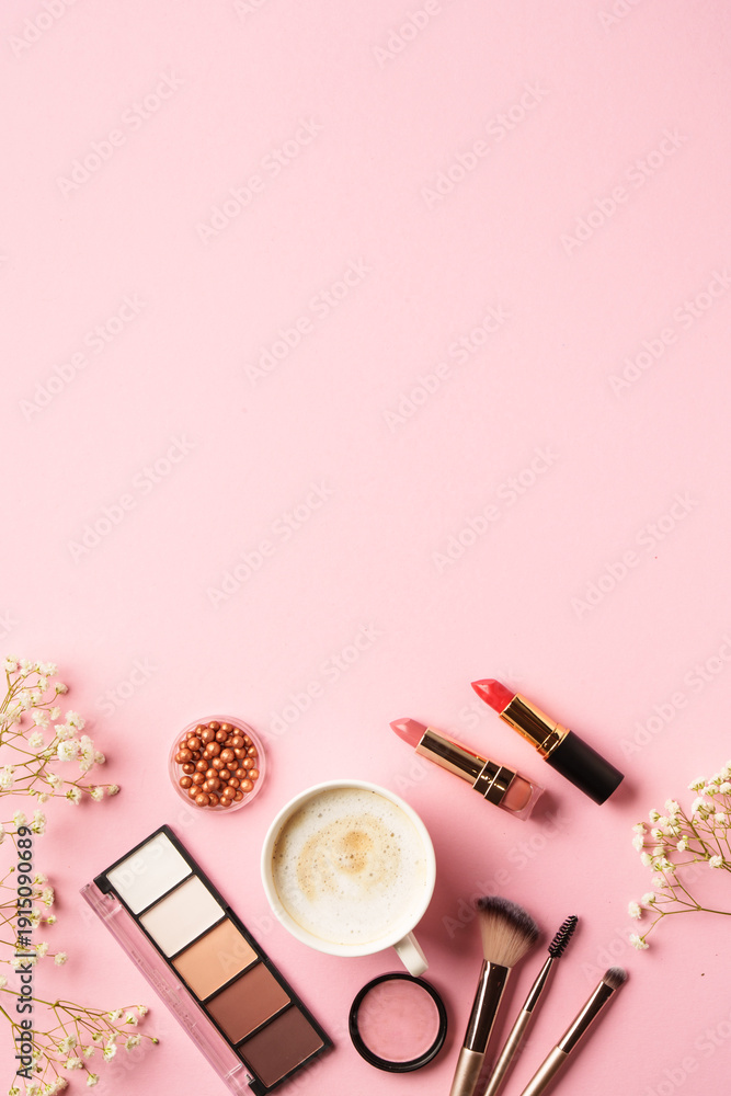Woman flat lay on pink background. Eyeshadow, lipsticks and cup of coffee with easter eggs. #1915090689