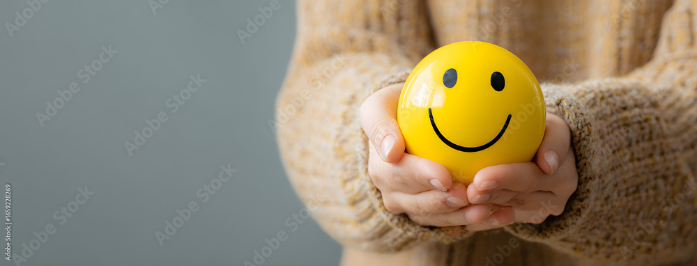 Woman hand holding happy smile sphere, Positive thinking, Mental health assessment , World mental health day concept #1659228269