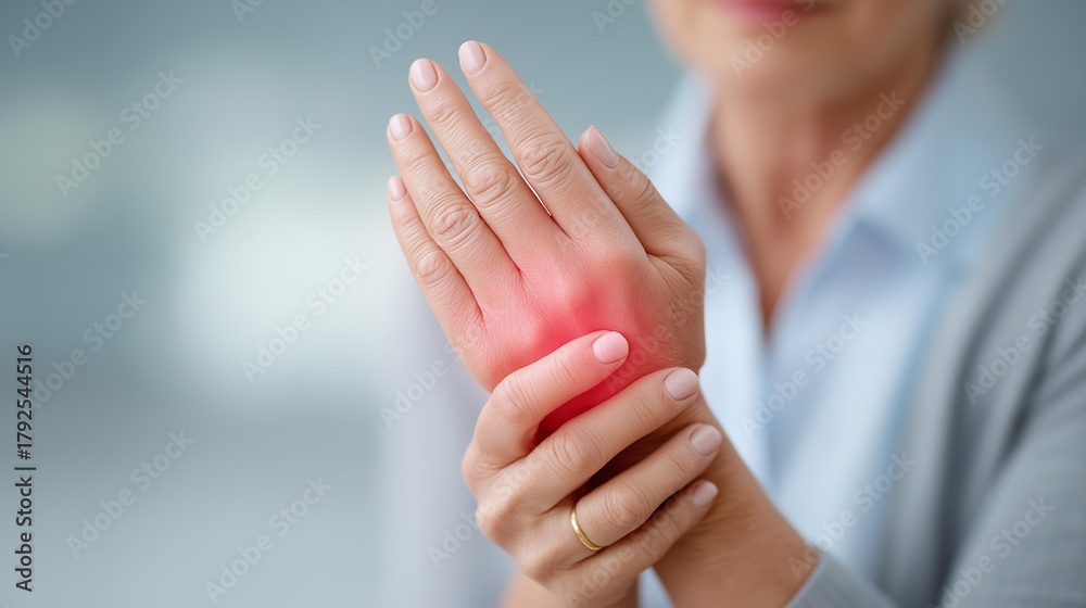 Woman hands holding wrist with pain indicator defocused arm, faceless carpal tunnel, medical visualization detail, blurred suffering background, numbness concept, syndrome interfac #1792544516