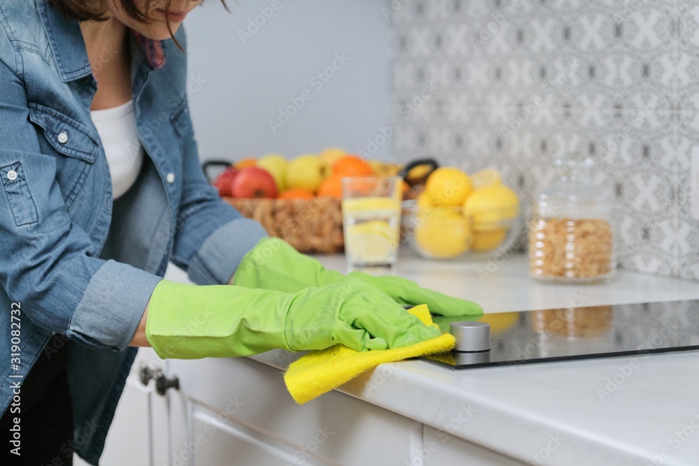 Woman hands in gloves washing and cleaning electric hob in kitchen #319082732