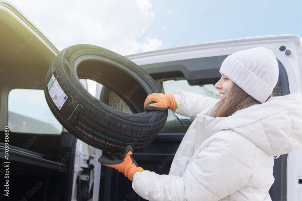 Woman happily loads new tires into her car trunk for a seasonal change while enjoying a sunny day outdoors #1703960680