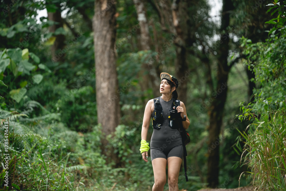 Woman Hiking on Forest Trail Surrounded by Lush Greenery in Daylight, Embracing Nature and Adventure on an Outdoor Journey #1785474413