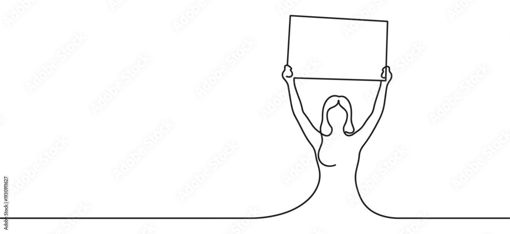 Woman holding a blank sign above her head, depicted in a minimalist continuous line art style, symbolizing protest or advocacy. #1930911627