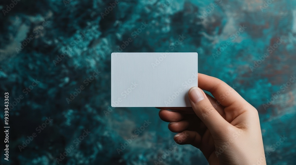 Woman holding blank card, teal background, mockup #1939343303