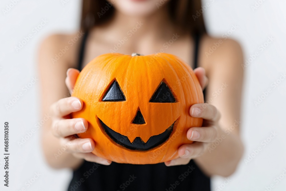 woman holding carved pumpkin forward, Halloween decoration concept closeup with light background #1685110350