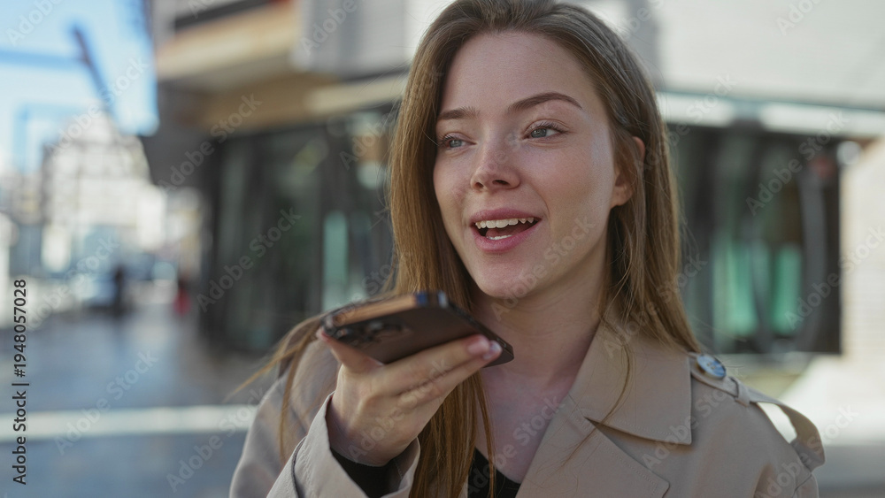Woman holds smartphone to her mouth while speaking into it on a busy urban street, eyes focused ahead; connection. #1948057028