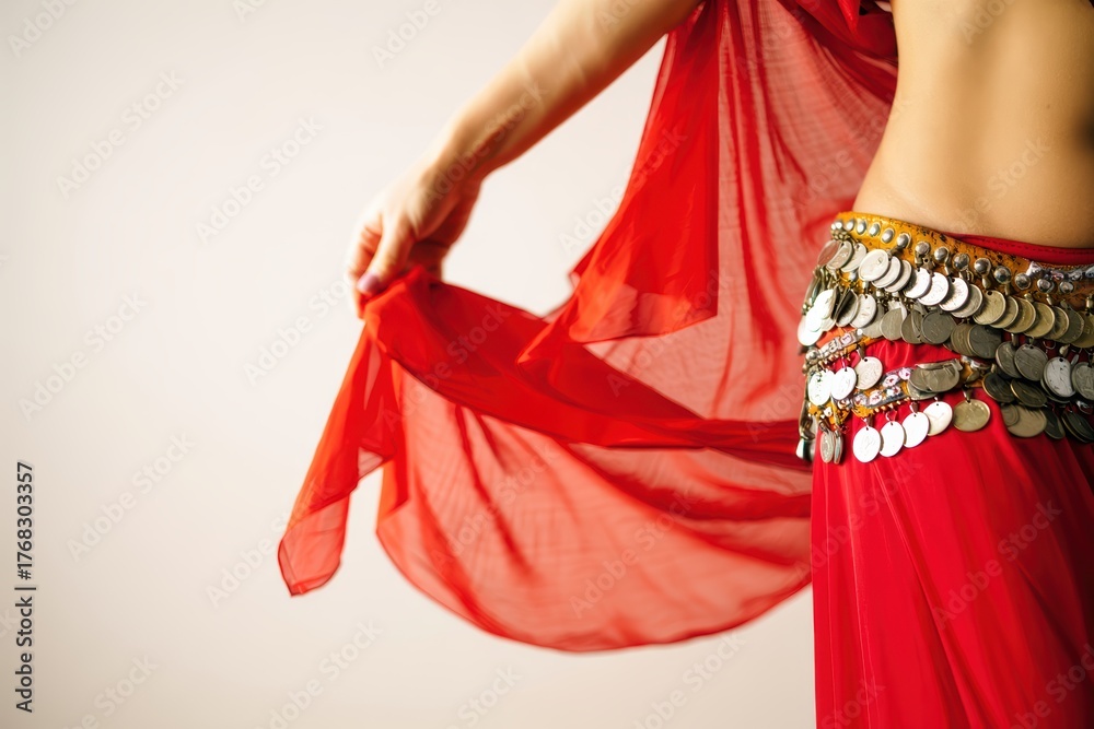 Woman in a red belly dance costume gracefully moving with flowing fabric #1768303357