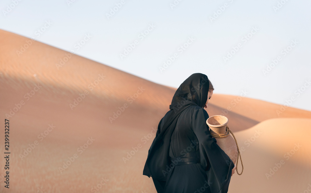 woman in abaya (emirati traditional dress) in a desert with water dish #239932237