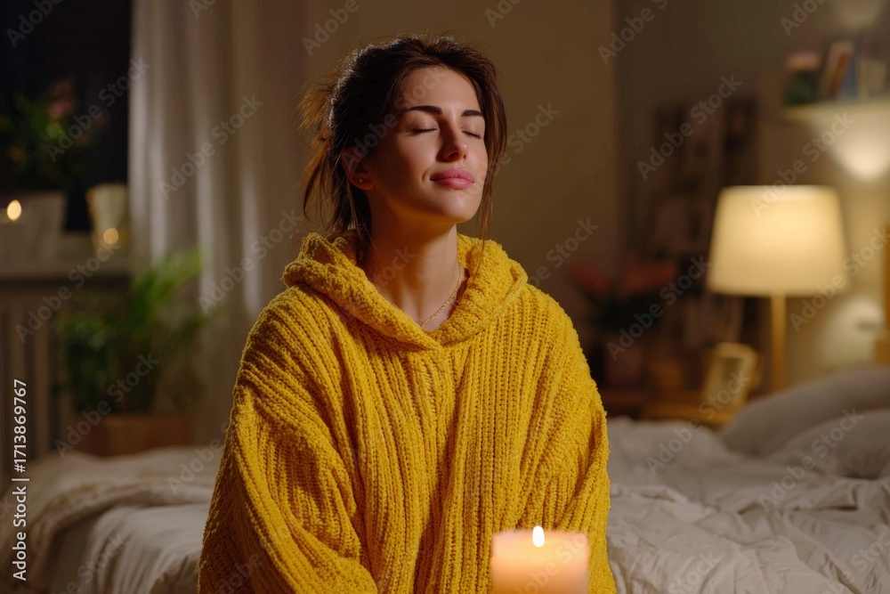 Woman in cozy yellow sweater practicing mindfulness in a warmly lit bedroom during evening relaxation #1713869767